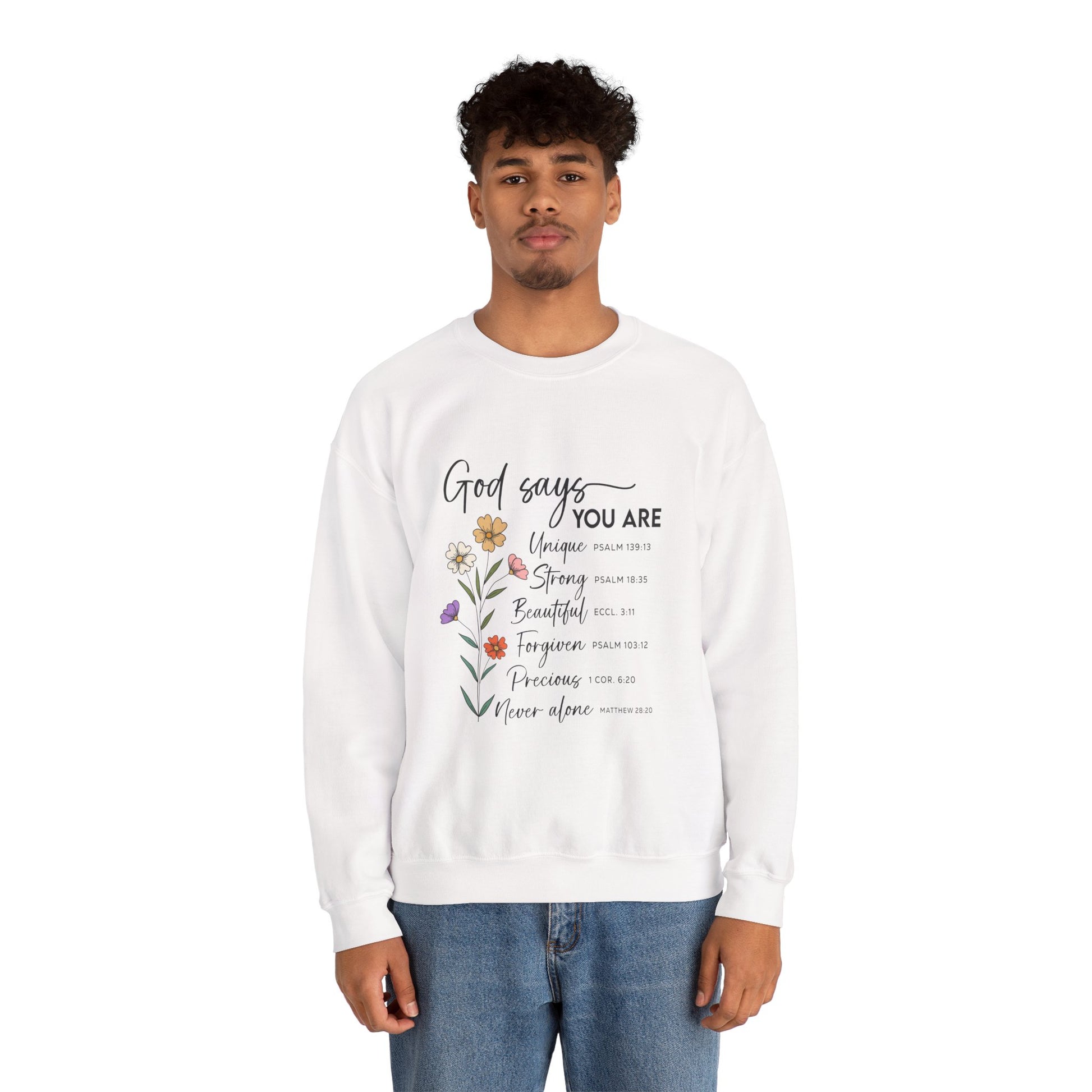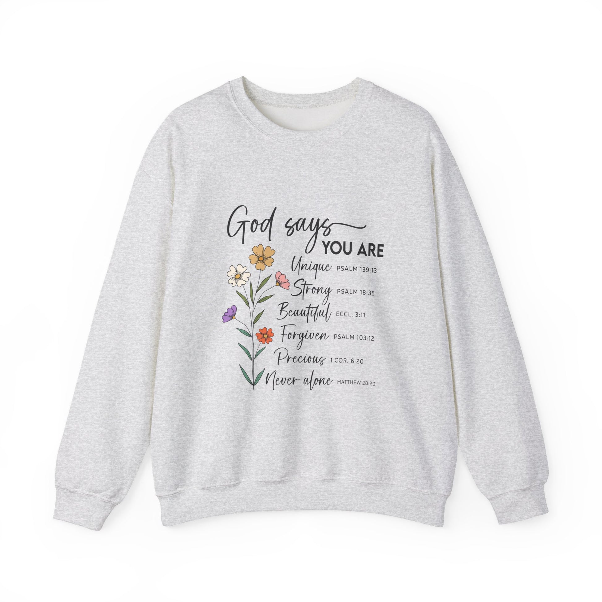 Wrap yourself in comfort and confidence with our “God Says You Are” Christian Sweatshirt — a meaningful reminder of your God-given identity. Featuring uplifting words like unique, strong, beautiful, forgiven, and precious, this faith-inspired design encourages you (or someone you love) to walk boldly in truth every single day.