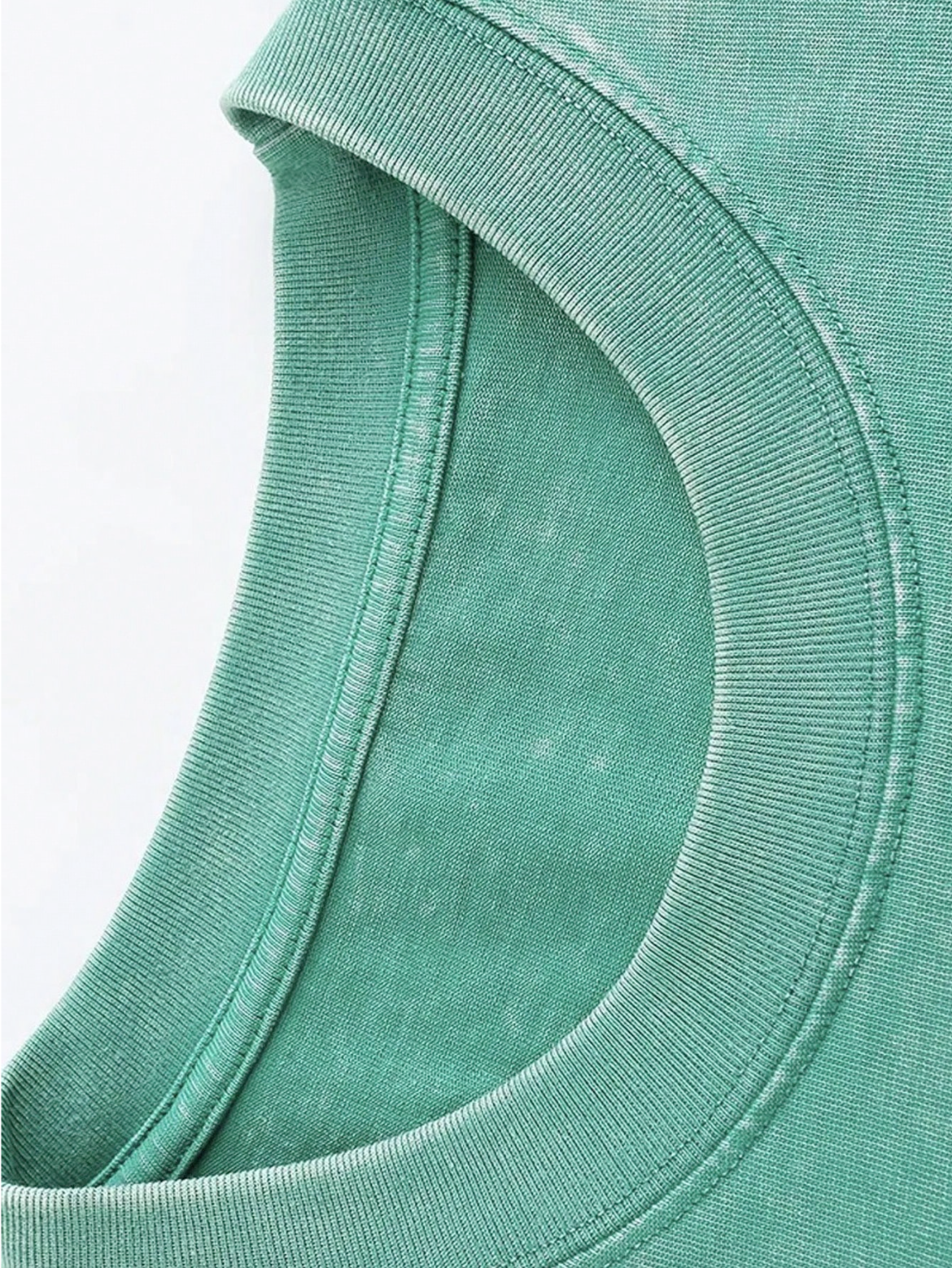 - Tubular knit (no side seams) with double-needle stitching for durability